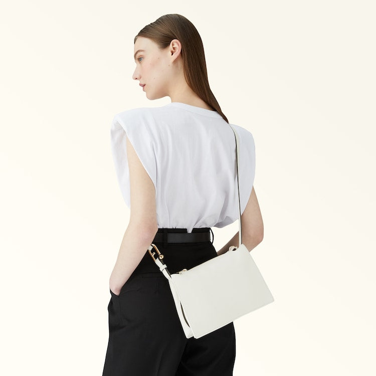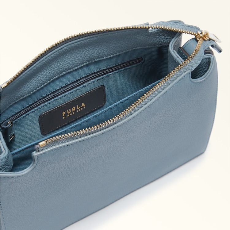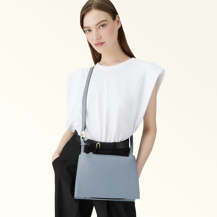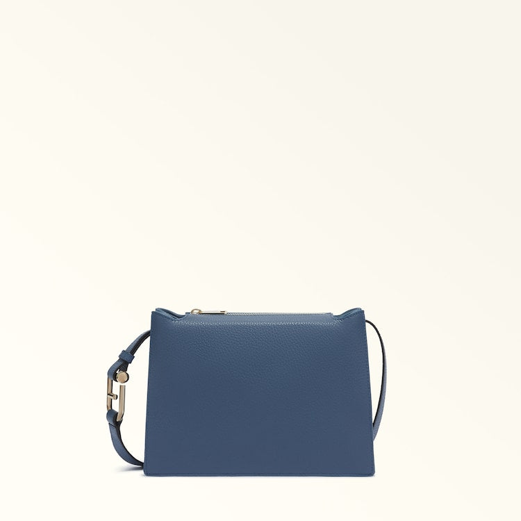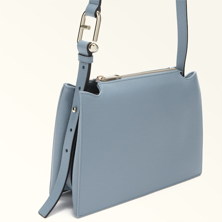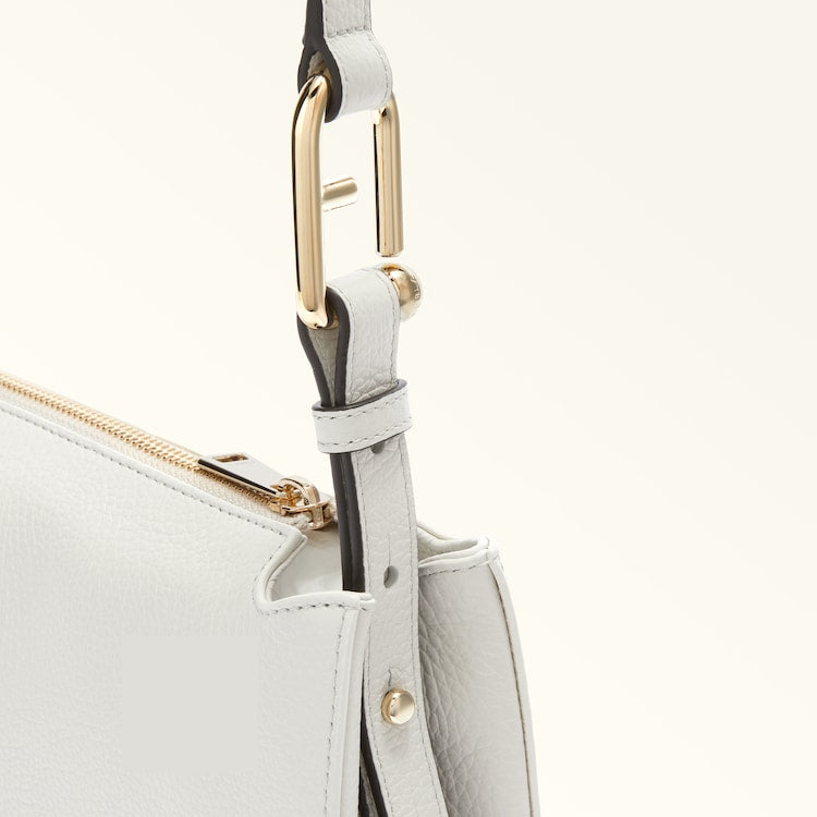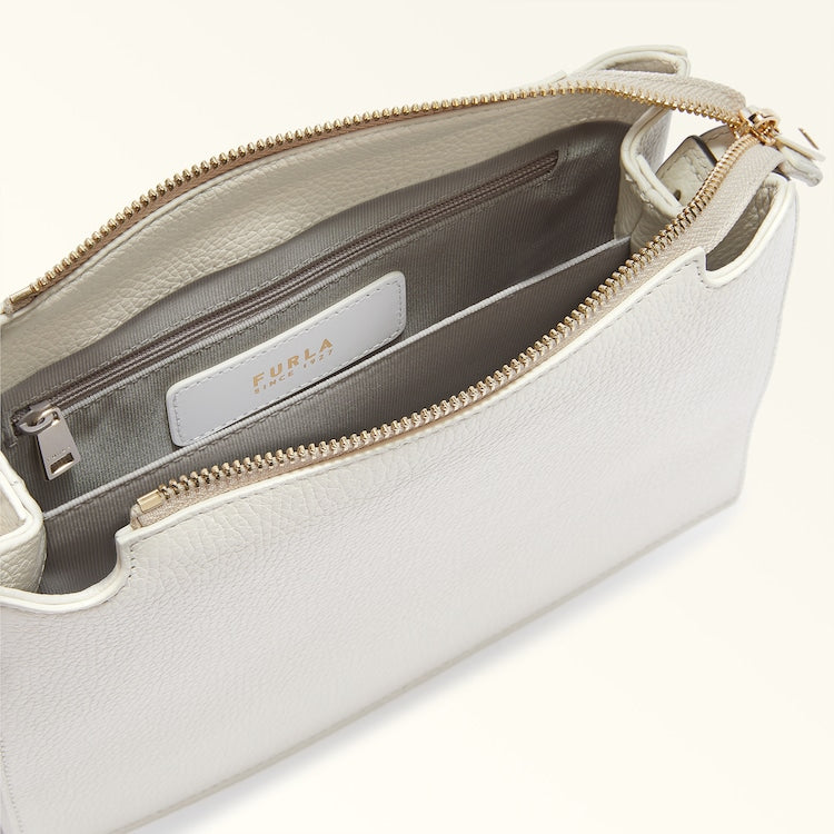 The small Furla Nuvola crossbody exudes a soft, delicate allure. Made of fine textured leather, it features a square geometric silhouette, two open inside compartments with a central divider and a top zip closure. Its detachable shoulder strap has an adjustable length, sitting comfortably on the shoulder or across the body. The Arcosfera hardware adds a unique detail to the bag, combining the iconic Furla Arch logo with the brand's original spherical hallmark.